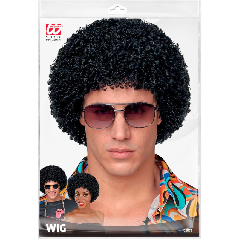70’s Disco style black wig. Material: 100% polyester. Hand wash, bleaching not allowed, do not dry in drier, do not iron, do not dry clean.