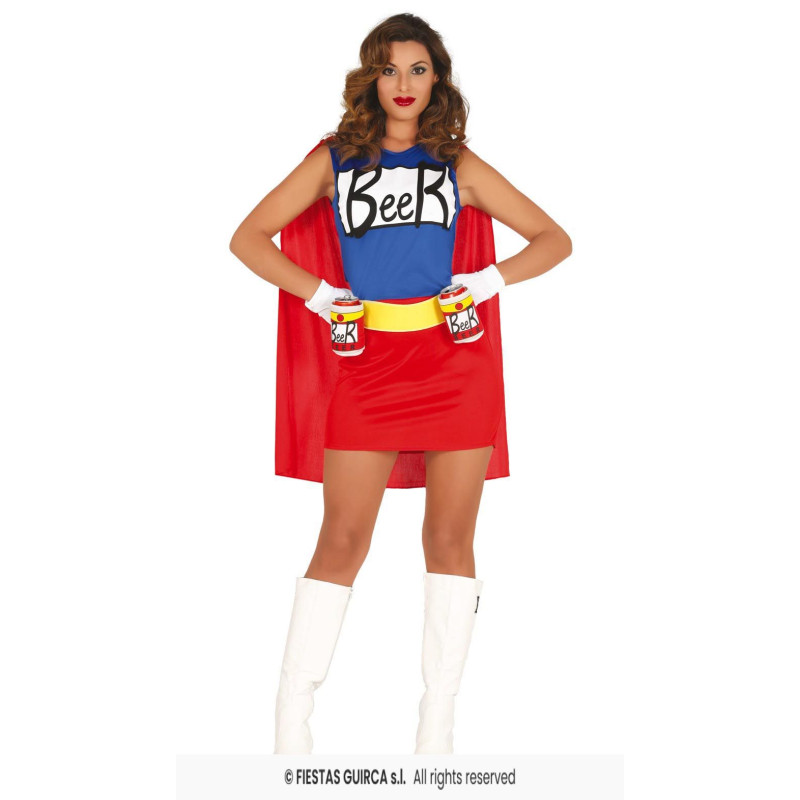 Beerwoman costume: stylish dress, belt, drink holder, and cape, creating a fun and playful image of a woman who loves beer - a great and cheerful choice for themed parties or celebrations!