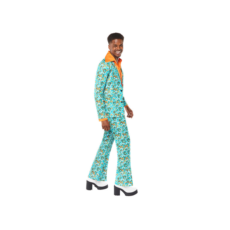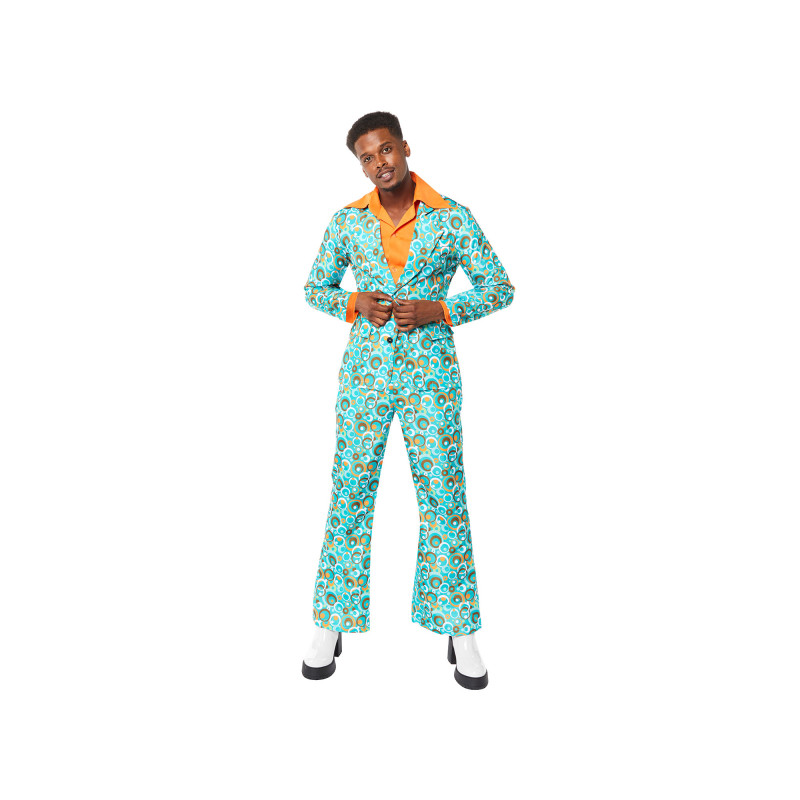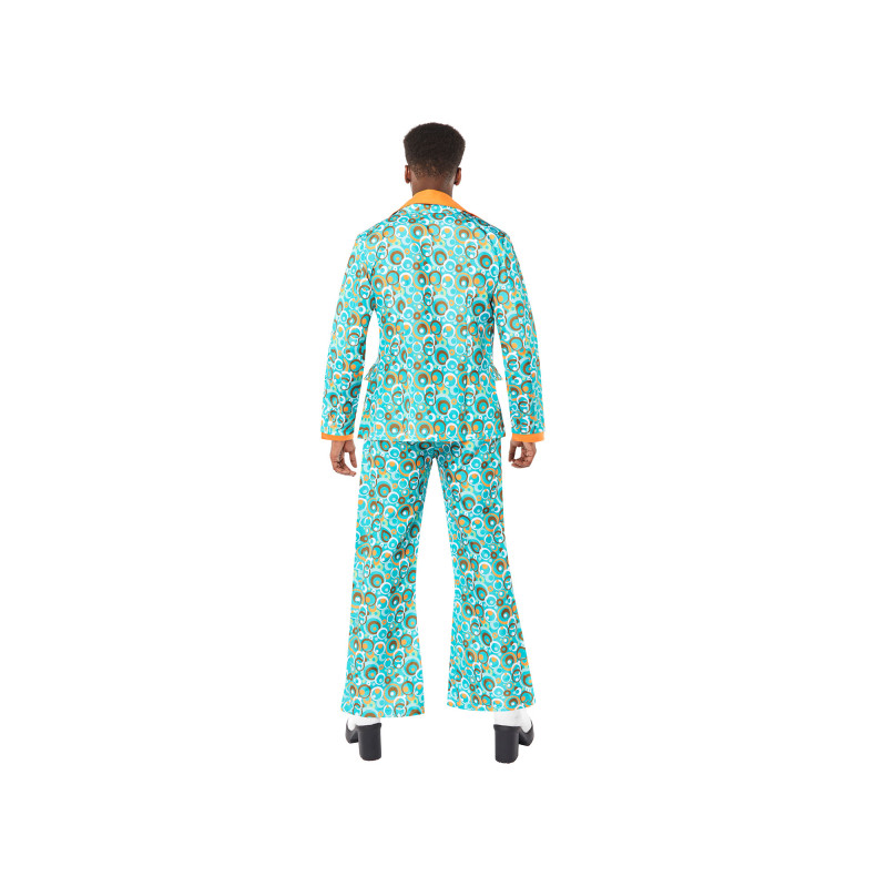 Embark on a journey back in time with this stunning 70s party costume for men! The set includes a colorful, geometric patterned jacket and matching flared trousers that reflect the authentic spirit of the disco era. This stylish costume is perfect for themed parties, carnivals, or any occasion where you want to look impressive and attract attention.
