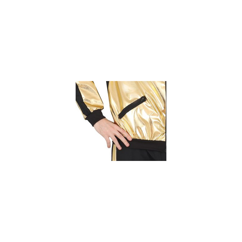 CONTENTS of this metallic gold tracksuit mens fancy dress costume: Jacket, Trousers. NOT INCLUDED: Golden Cap, Further 90s Accessories