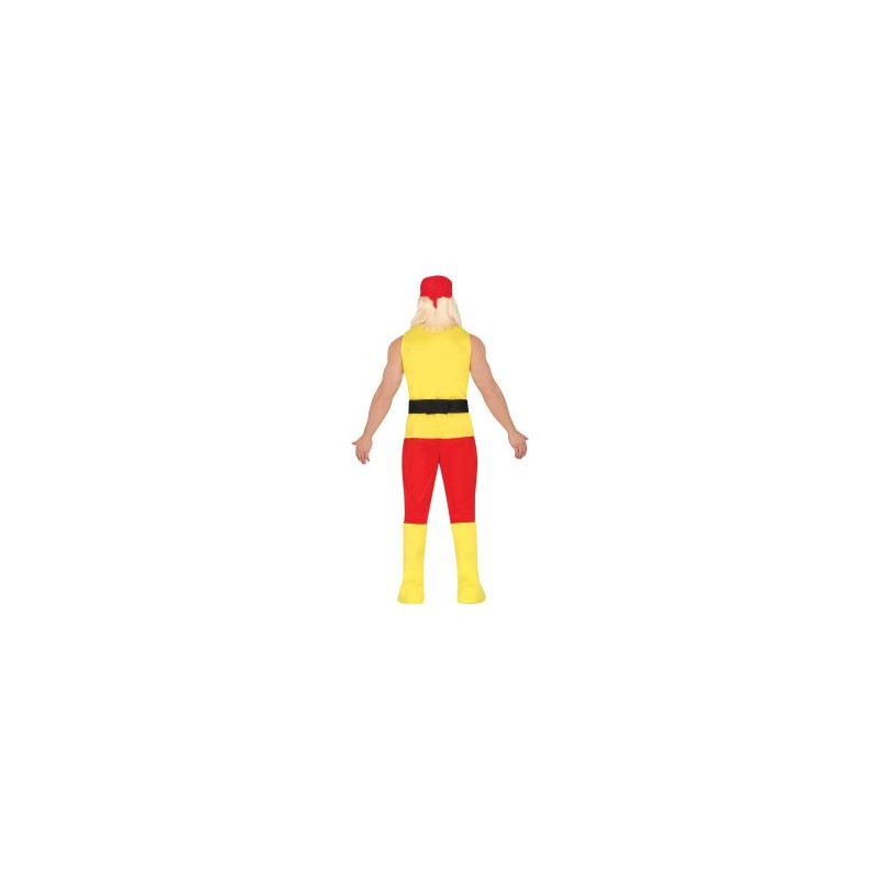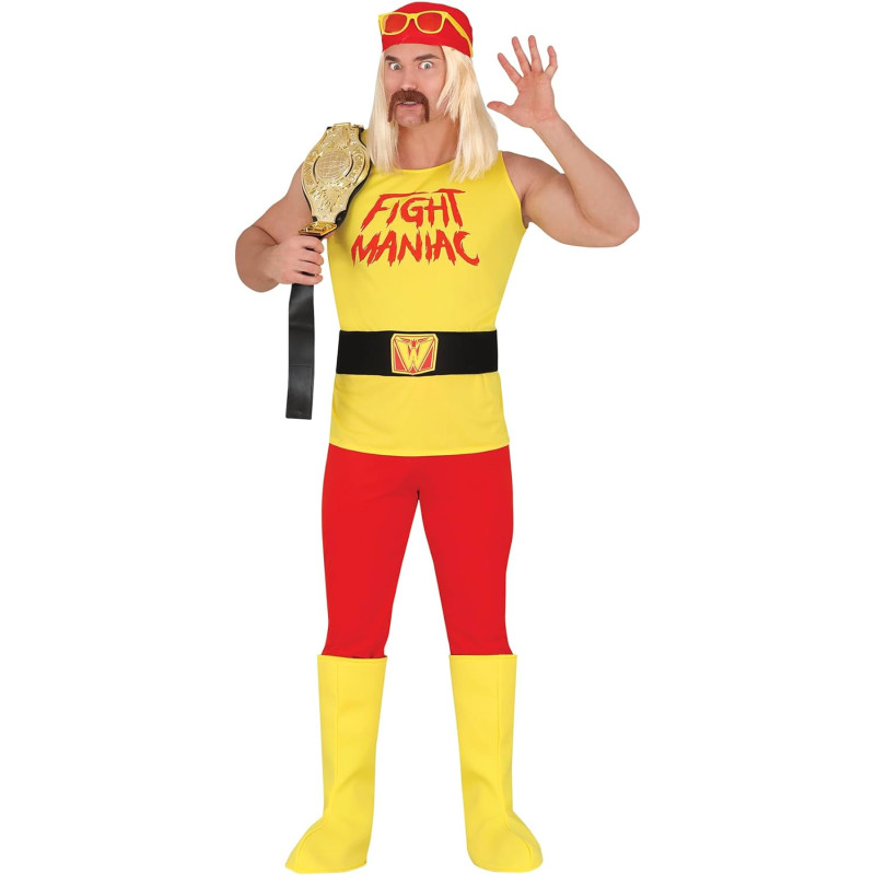 CONTENTS of this fight maniac mens fancy dress costume: Scarf, T-Shirt, Belt, Trousers, Boot Covers. NOT_INCLUDED: Glasses, Wrestling Champion Belt •MATERIALS: These fancy dress costumes for men are made of 100% polyester and meet all safety standards so that you can have a great time at your next costume party. • adult fancy dress costumes men: a great choice for your fancy dress or theme party