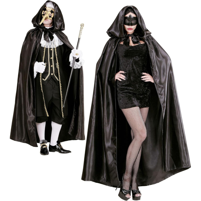 Elevate your masquerade or theatrical ensemble with this exquisite, high-quality black satin hooded cloak. Providing an air of mystery and elegance, this luxurious cloak is meticulously crafted to ensure a stunning and dramatic appearance. Perfect for formal events, costume parties, or theatrical performances, this cloak is a timeless addition to your wardrobe, offering versatility and sophistication.