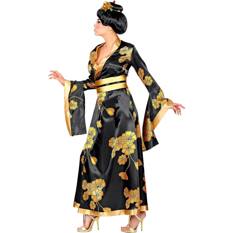 With this fancy dress costume you can transform yourself into a seductive geisha. The costume includes the floor length kimono and the golden belt. The black kimono is designed with trumpet sleeves and printed with golden flowers.
