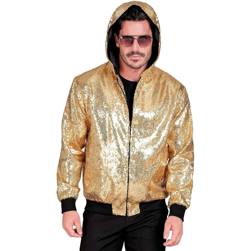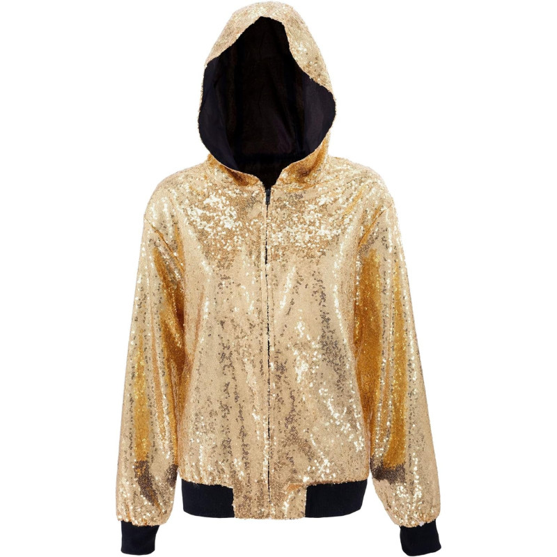 Sparkle in Style with our Gold Sequin Hooded Bomber Jacket for Carnival