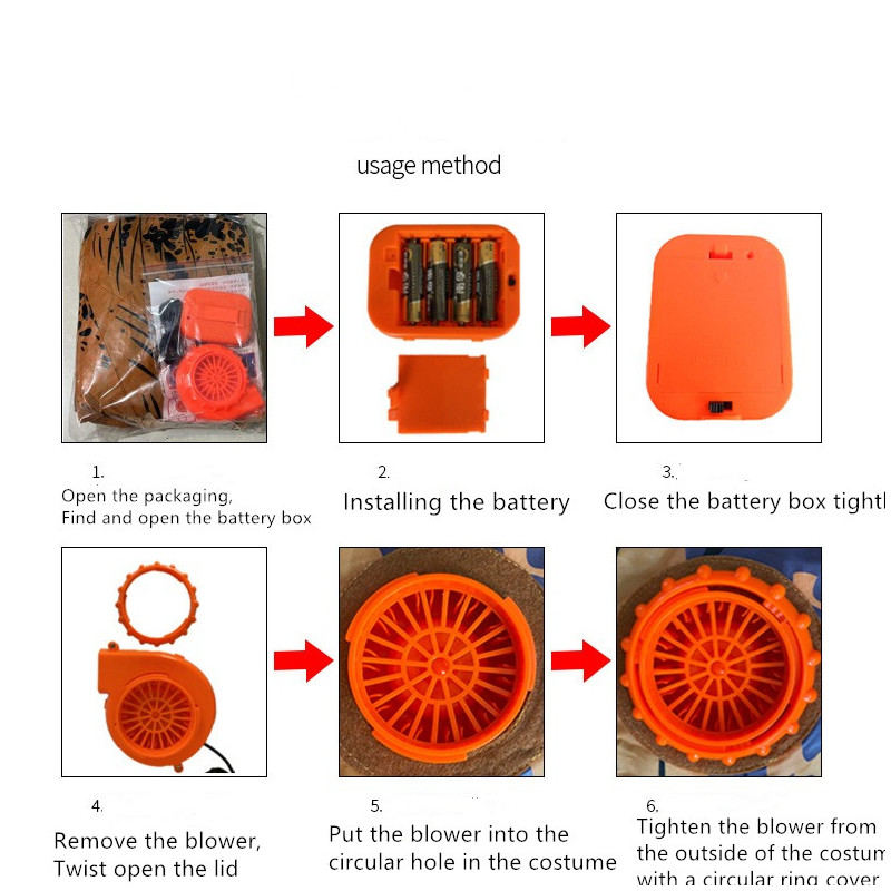 Inflatable alien costume for adults suitable for kids with a height of 120-145 cm. Consists of a costume and a fan. The fan operates on 4 AA batteries (not included) or via USB connection.