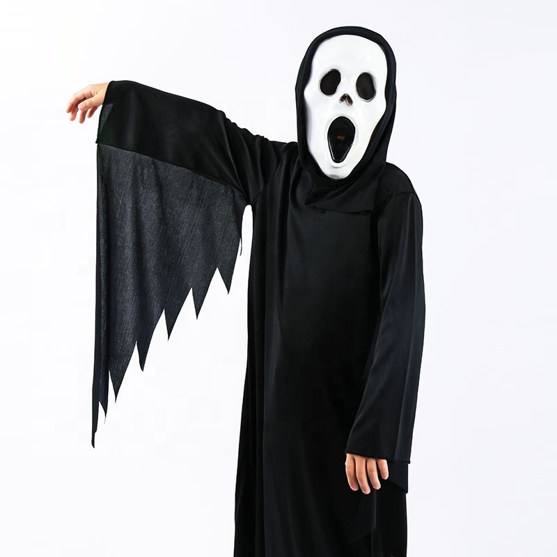 This ghost costume features a long black cloak with wide, jagged sleeves that create a dramatic and mysterious look. The included white mask enhances the spooky effect and helps create a complete ghost appearance.