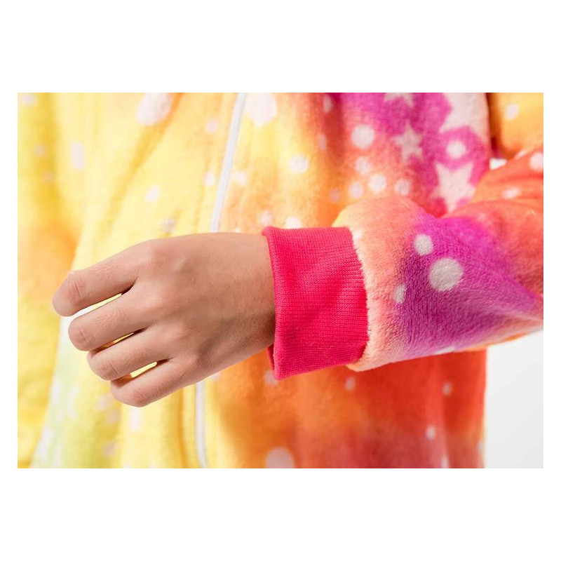 The jumpsuit features a colorful pattern decorated with stars, creating a playful and whimsical look. The hood is designed as a unicorn head with a horn, ears and cute character details that instantly bring the magical creature to life. A fluffy tail on the back completes the unicorn appearance and adds even more charm to the costume.