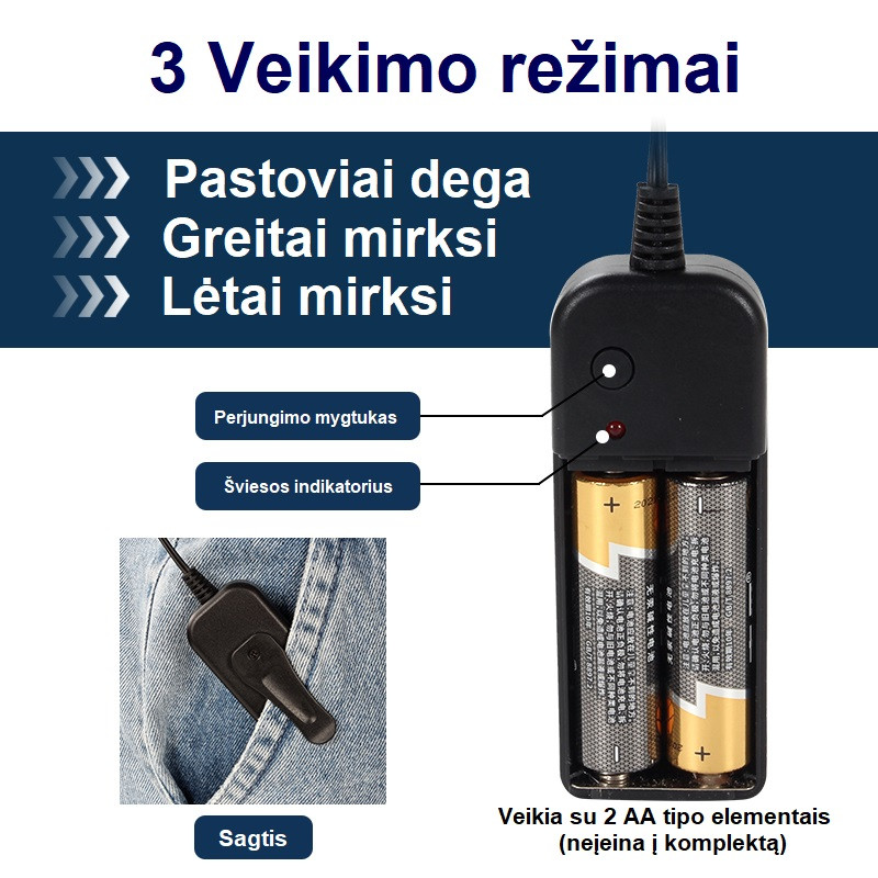 3 operating modes: steady, fast flashing, slow flashing.