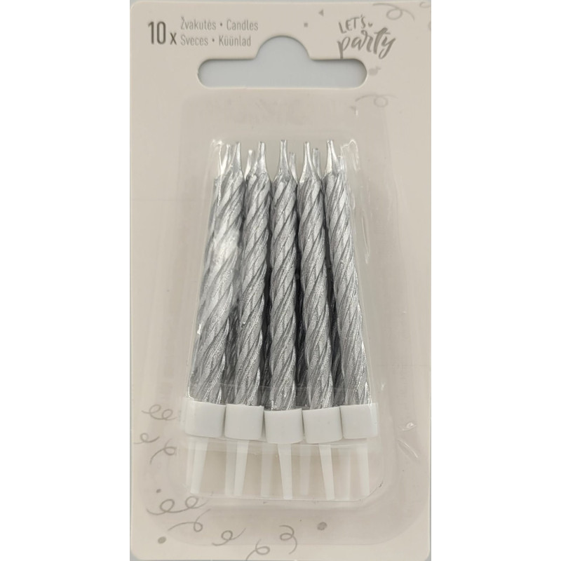 Silver colored birthday candles, 10 pcs. (with plastic holders)
