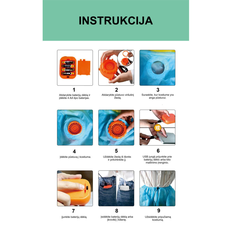 Täispuhutav Oktoberfesti kostüüm täiskasvanutele - lõbus ja originaalne riietus pidudeks ja tähistamisteks. Sobib inimestele pikkusega 150-190 cm. Komplekti kuulub ventilaator, mida toidab 4 AA patareid (ei kuulu komplekti) või USB kaudu.