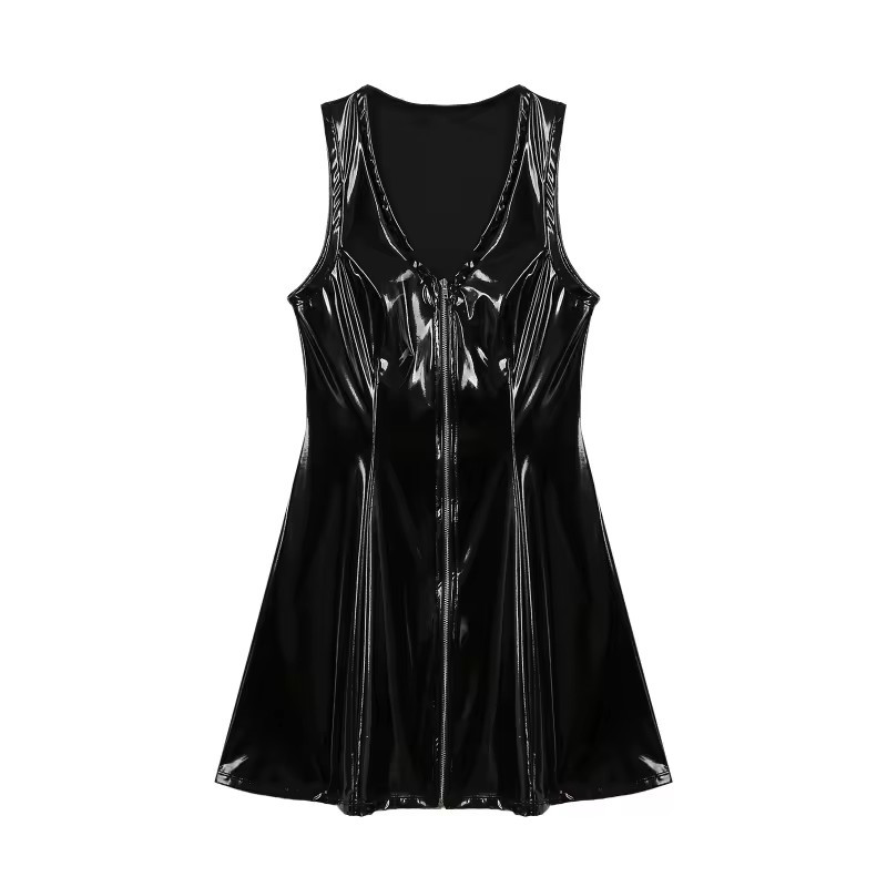 Läikiv välimus, ees tõmblukuga V-kaelus, varrukateta, lehviva A-lõikega disain.