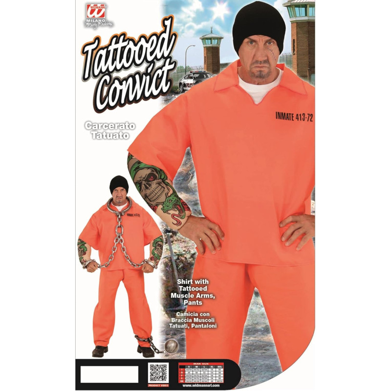 Tätoveeritud vangi kostüüm meestele sisaldab tätoveeritud musklitega varrukatega pluusi ja pükse. See on ideaalne karnevaliks, teemapeoks ja muudeks sündmusteks.