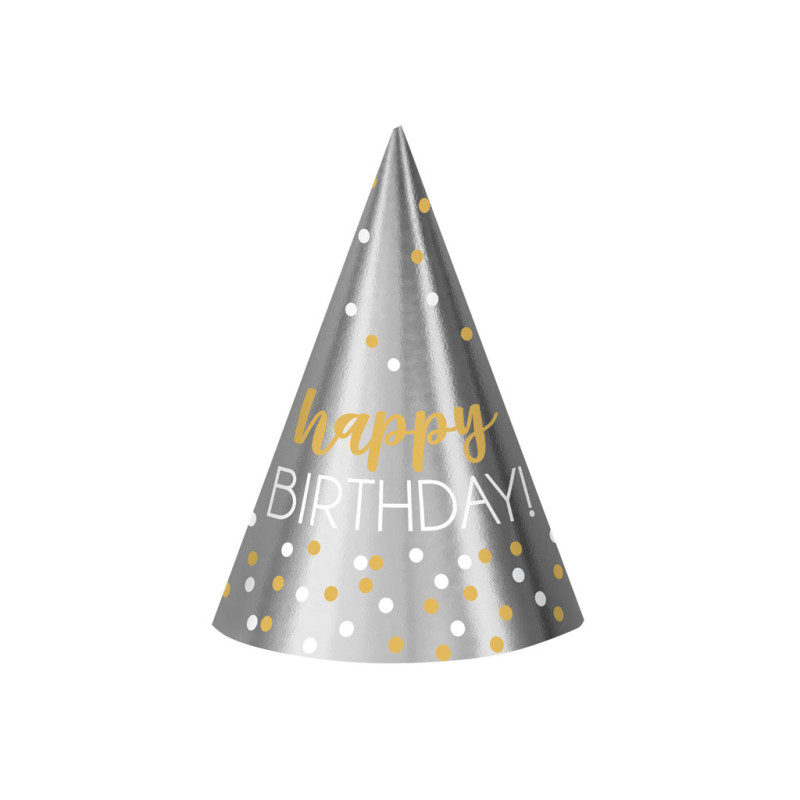 Hõbedased mütsid valgete ja kuldsete täppidega – rõõmsameelne aksessuaar teile ja teie peokülalistele.